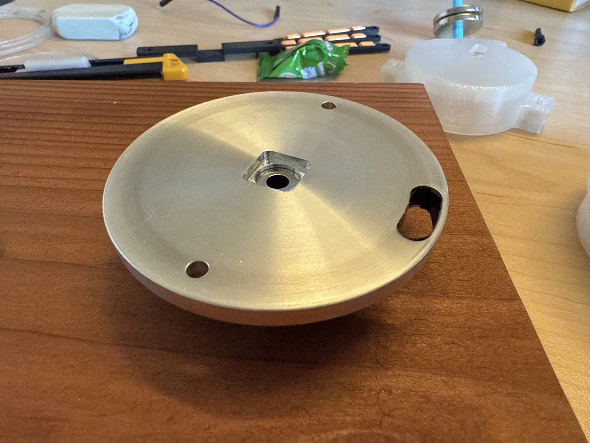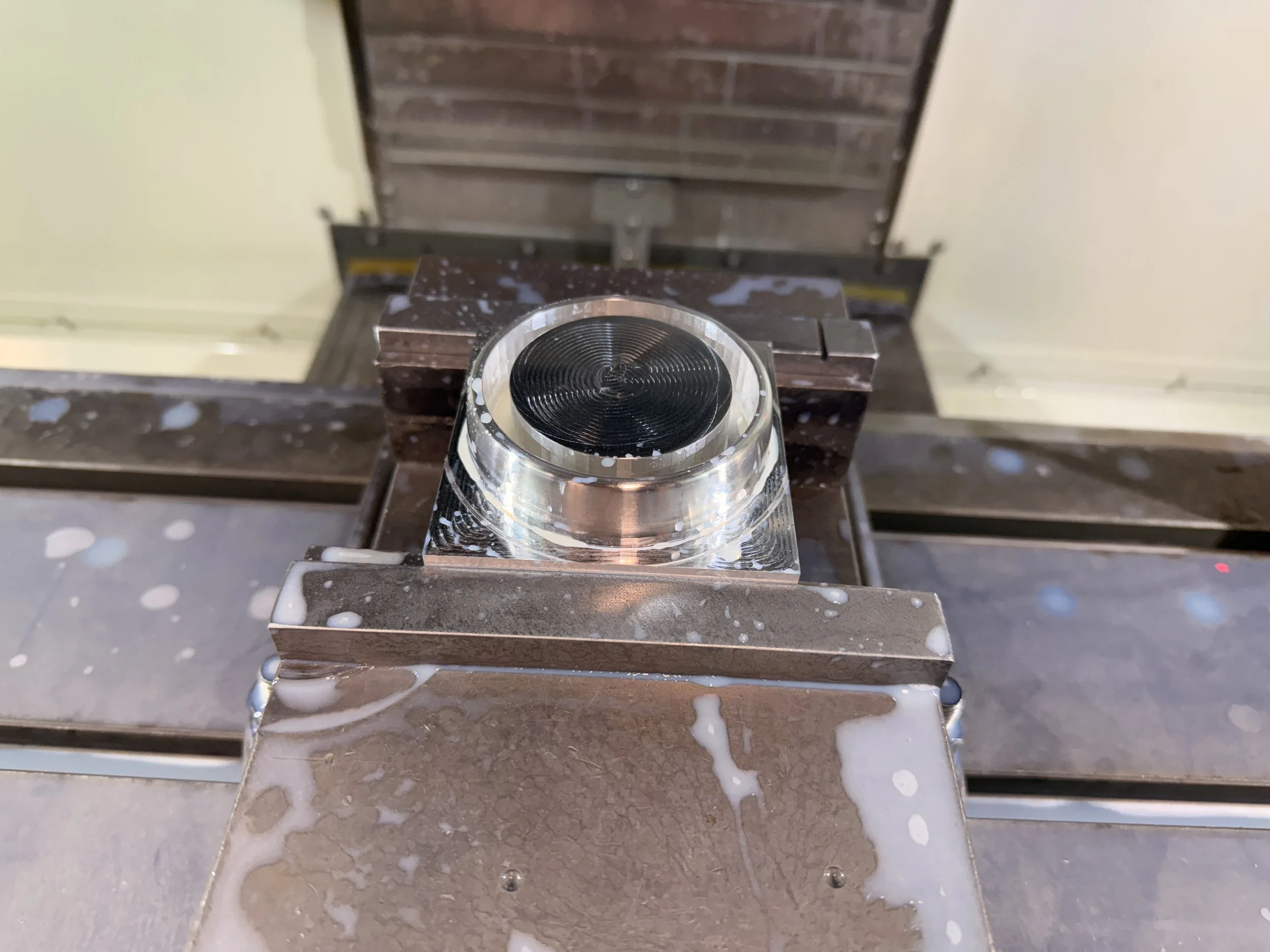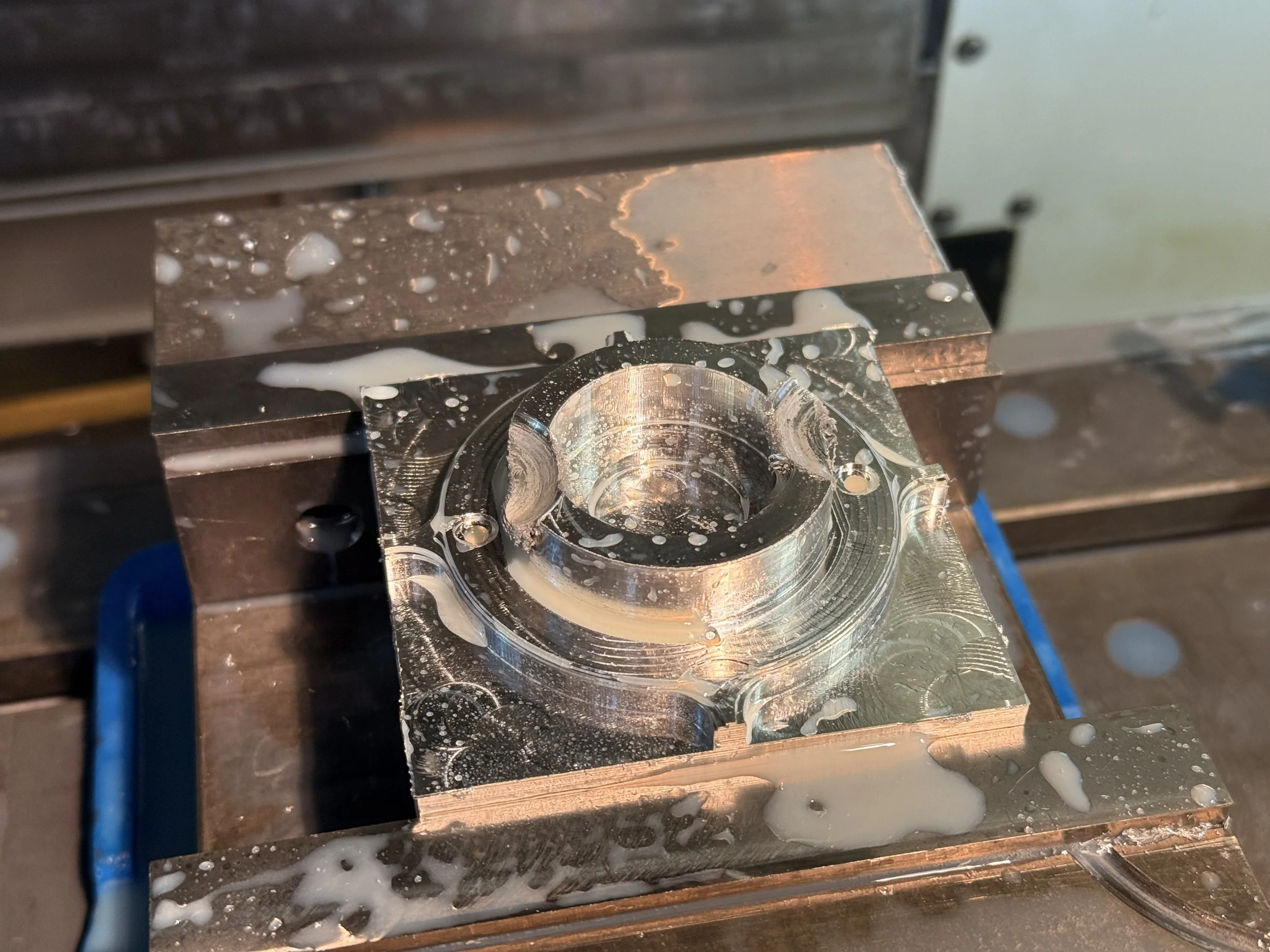 There was a lot to account for when machining the body. The body was initially a flat cylinder with the glass meeting at the very edge. However, limitations with the size of the electronics require some changes, so the exterior has a pillowed shape. This created a challenge holding it in the vise for the 2nd setup since all the v-blocks in the lab were either too small to hold the part or too high for the vise. Since we had a limit of 10 hrs scheduled machining time for the week, I had to think of a quick solution. I decided to add two small flats to either side and allow the vise to grip.
