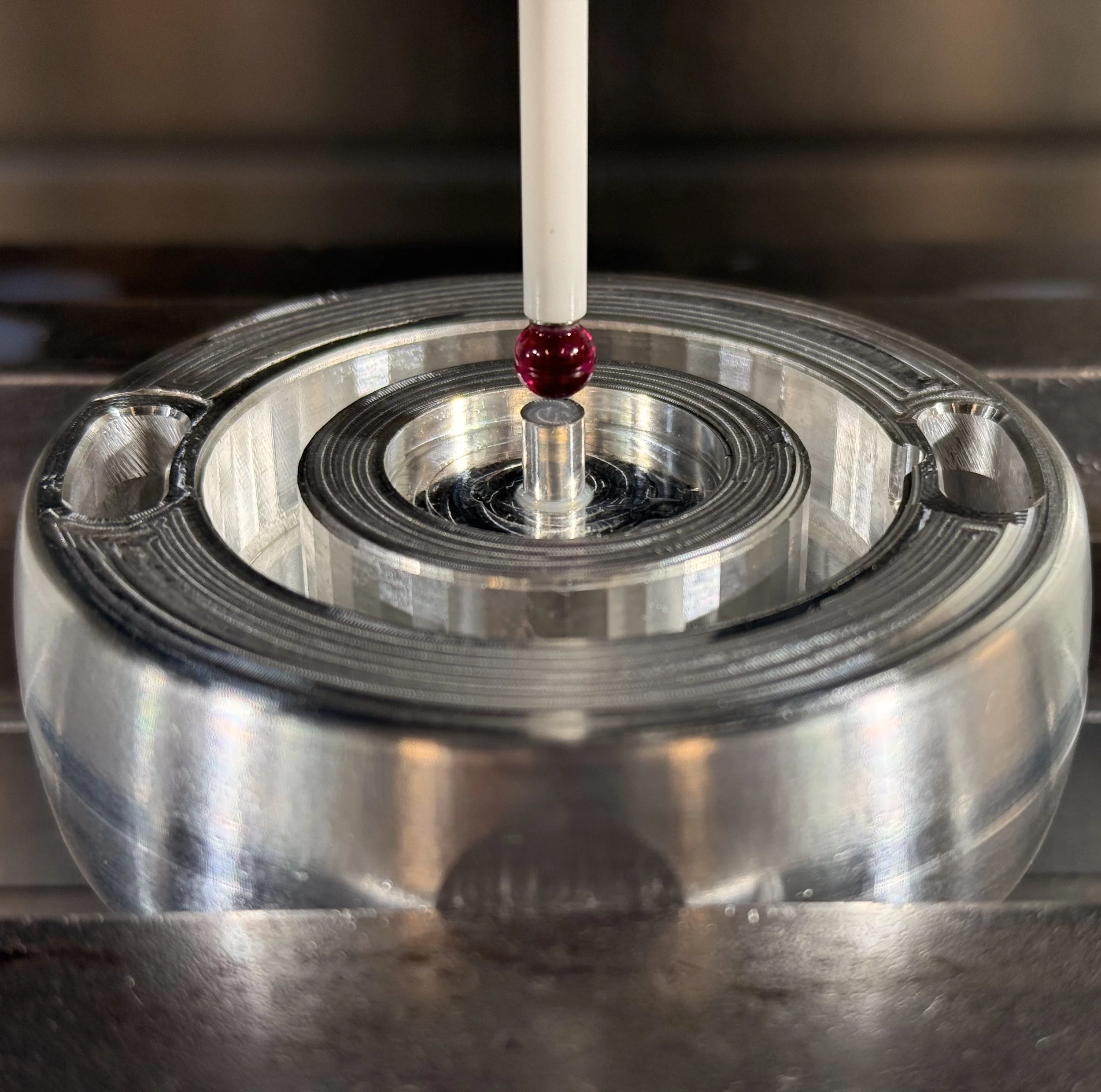 Unfortunately for my first part, I accidentally chose the ball end mill for my flat operation instead of a flat end mill leaving cusps all around. There was an open machining spot that evening, so I took advantage of it. I decided to probe my part with a cylindrical boss. Oddly enough, the probe was a bit off axis even after multiple attempts. I decided to run it and shave off the cusps conservatively to prevent it from accidentally nicking off the stem.
